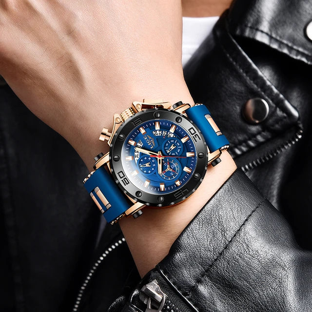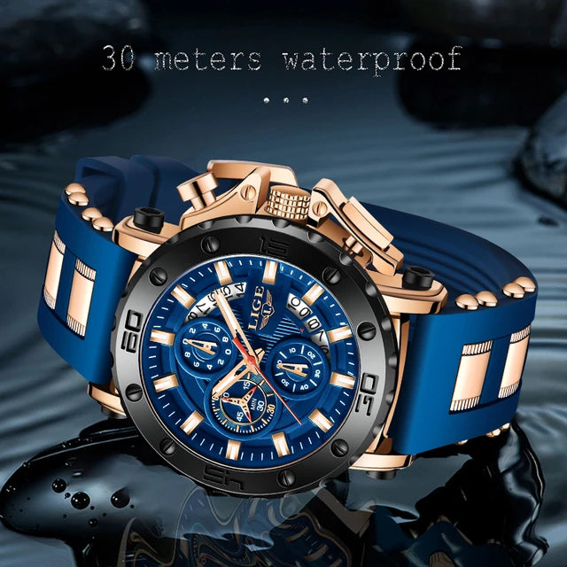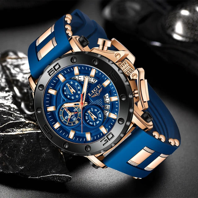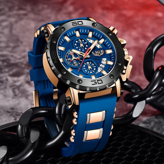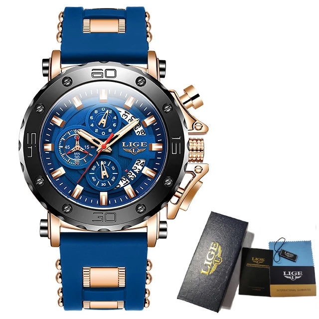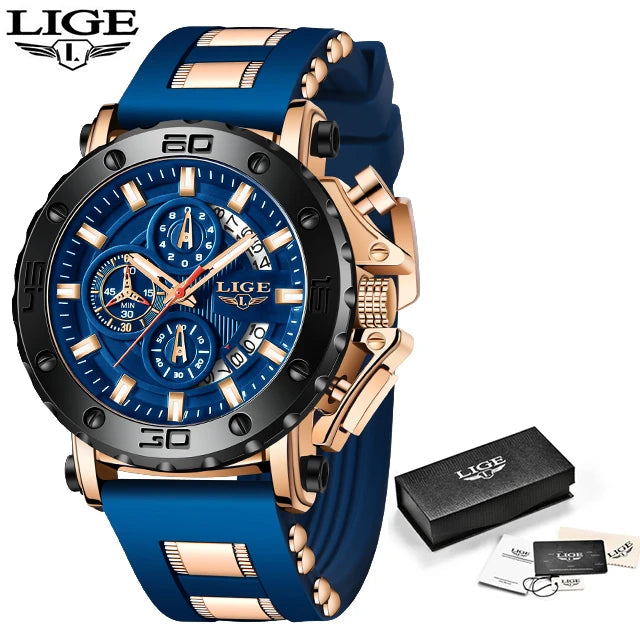 LIGE Watches Men Sport Chronograph Quartz Men Watch Fashion Blue Silicone Strap Big Dial Wrist Watch Male Waterproof Date Clock