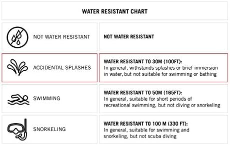 Water resistant to 30m (100ft): in general, withstands splashes or brief immersion in water, but not suitable for swimming or bathing