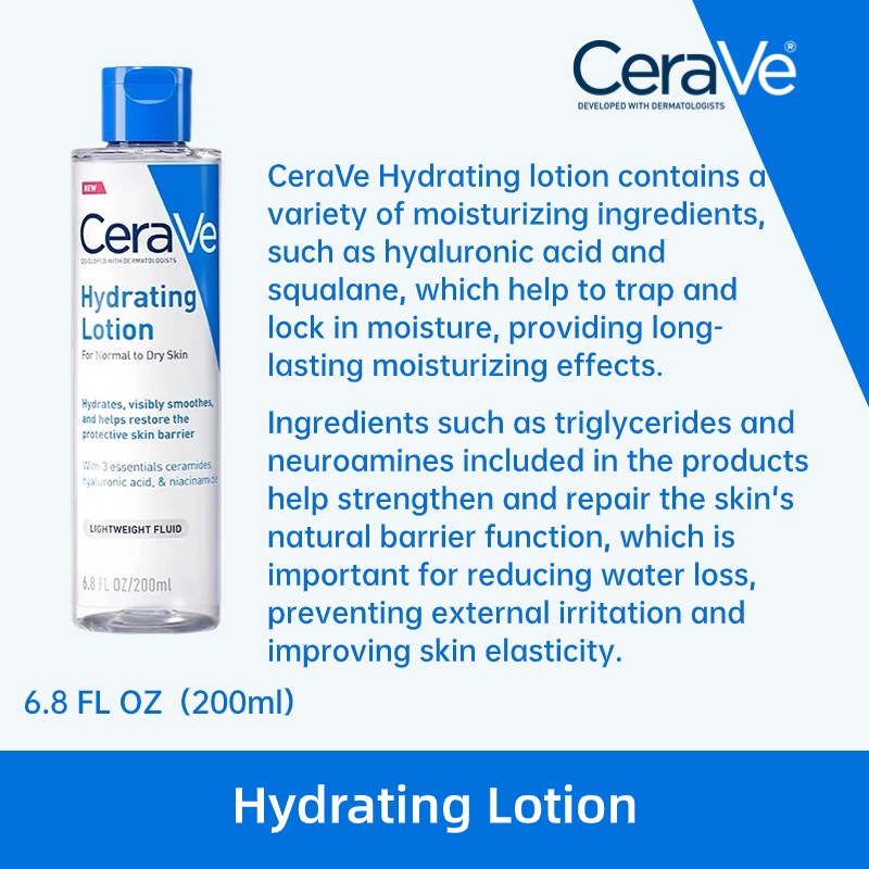 CeraVe Hydrating Lotion is a lightweight, non-greasy fluid designed to provide long-lasting hydration and help restore the protective skin barrier. Developed with dermatologists, this lotion is enriched with 3 essential ceramides, hyaluronic acid, and niacinamide to keep your skin feeling soft, smooth, and nourished throughout the day.