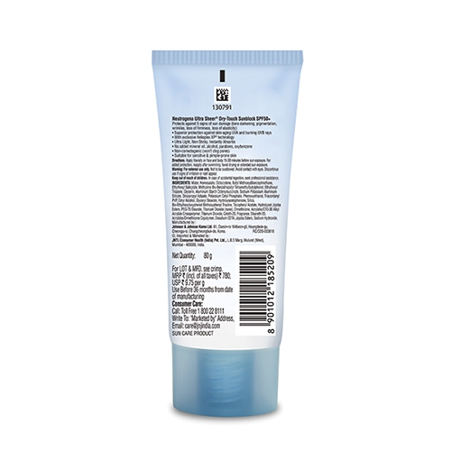 Neutrogena Ultra Sheer Dry-Touch Sunblock SPF 50+ is a dermatologist-tested sunscreen formulated with Helioplex® Technology for superior sun protection. It delivers broad-spectrum coverage against harmful UVA and UVB rays while offering an ultra-light, dry-touch finish that absorbs quickly and won’t leave a greasy residue.